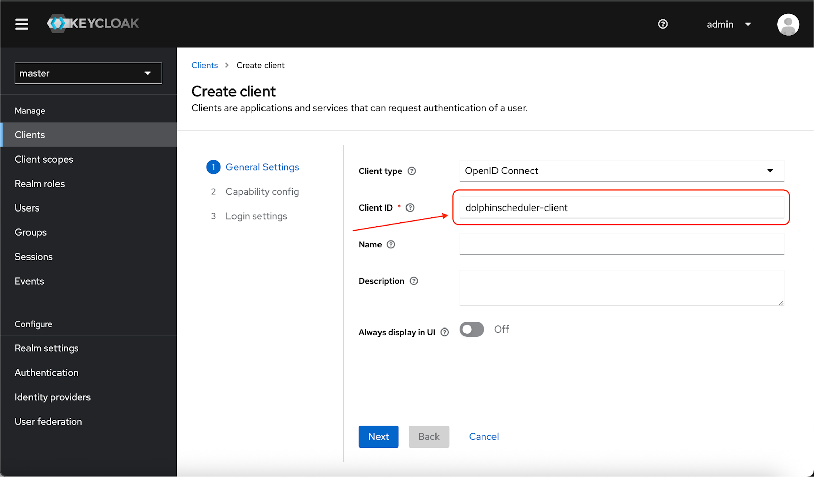 In your Keycloak instance, you’ll need to register DolphinScheduler as a new client.