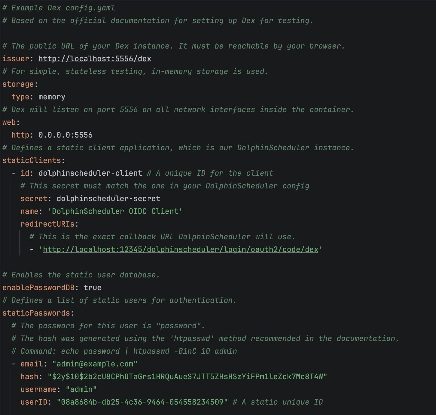 Step 1: Configure Dex. In your Dex configuration file, add DolphinScheduler to the
